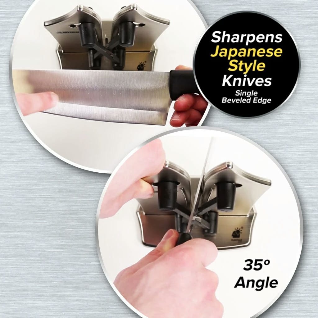 مبراة السكاكين اليدوية (بافارية) ذات النوابض المستقلة سهلة الاستخدام للغاية: يتم تمرير السكين صعودًا وهبوطًا لشحذه في ثوانٍ. مناسبة لجميع أنواع السكاكين، بما في ذلك المسننة، بفضل الأذرع المستقلة. تمنح شفرة حادة بسرعة لتسهيل تقطيع الطعام بكفاءة. أداة عملية للمطبخ توفر الوقت والجهد.