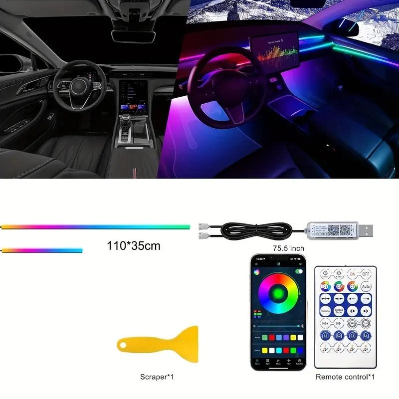 إضاءة LED تفاعلية مع الصوت للسيارة تأثيرات صوتية نشطة: مزودة بحساس صوتي يجعل أضواء LED تتزامن مع إيقاع الموسيقى وتغير وميضها حسب شدة الصوت. ديكور موسيقي أنيق: تضيف لمسة جمالية داخل السيارة أثناء القيادة ليلاً مع مزامنة الضوء مع الصوت. وضع النوم: تتحول الإضاءة تلقائيًا إلى إضاءة خافتة لتوفير جو مريح للنوم. ضبط درجة حرارة اللون: يمكن التحكم في شدة ودفء الإضاءة بسهولة لتناسب رغبتك.