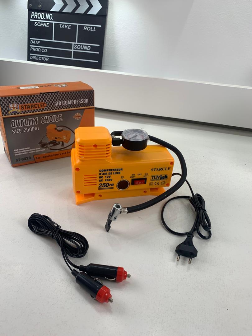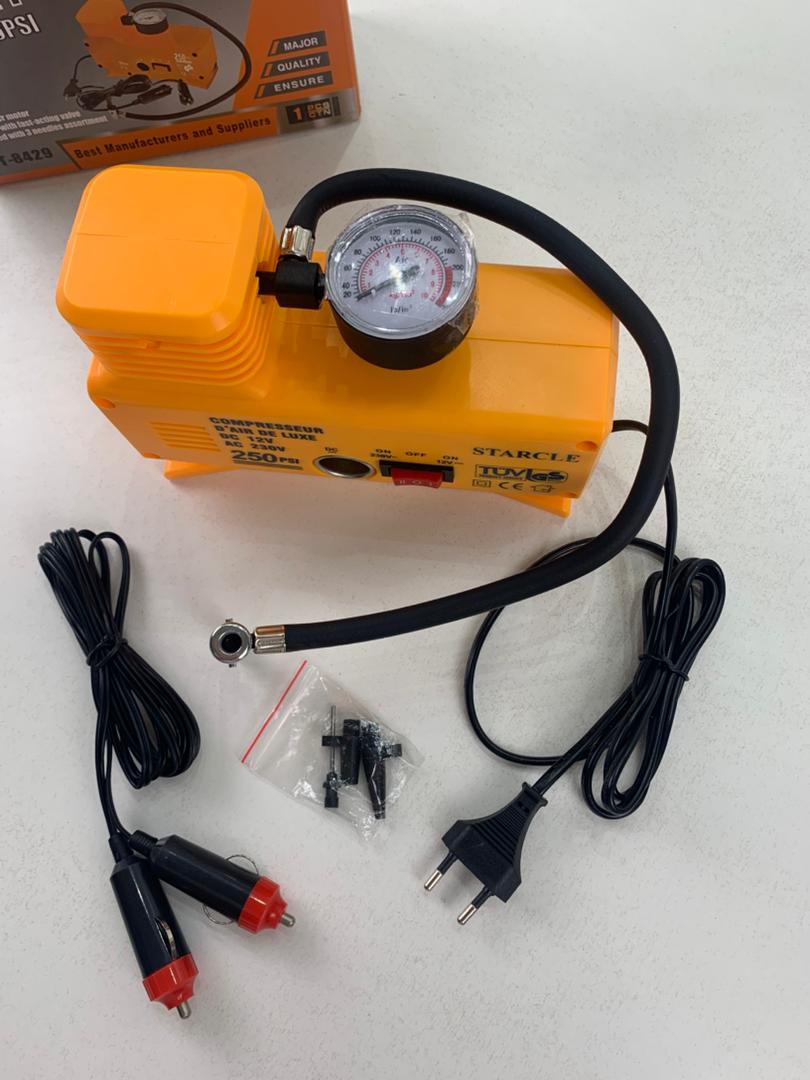 🔹 ضغط أقصى: 250 PSI 🔹 يعمل على 12V (ولاعة السيارة) و230V (مقبس حائط) 🔹 مقياس ضغط مدمج لضبط دقيق 🔹 تصميم صغير وسهل الحمل 🔹 عملية نفخ سهلة وسريعة في أي وقت