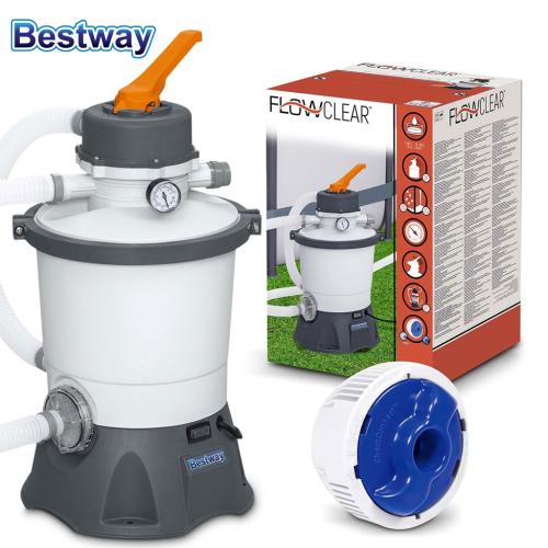 مضخة فلترة بالرمل من Bestway للمسابح لتنقية ميكانيكية للماء باستخدام رمل كوارتز مُنخل (0.45 – 0.85 مم). تحتوي الوحدة على مضخة، وصمام بست وضعيات لتغيير أنماط التشغيل، وعداد ضغط. أبرز المزايا: تنقية أفضل من المضخات ذات فلاتر الورق. استبدال الرمل كل 2 – 3 أشهر فقط. قدرة ضخ 3,028 لتر/ساعة. خزان مقاوم للتآكل. فلتر داخلي يجمع الأوساخ. موزع ChemConnect مدمج. المواصفات: أداء المضخة: 3,028 لتر/ساعة. أداء النظام: 2,006 لتر/ساعة. الحجم المناسب للمسابح: 1,000 – 16,000 لتر. سعة الخزان: 8.5 كجم من الرمل أو 240 جم من كرات Polysphere (تُشترى منفصلة). استهلاك الطاقة: 85 واط – جهد 220 فولت. الوزن بدون رمل: 8 كجم.