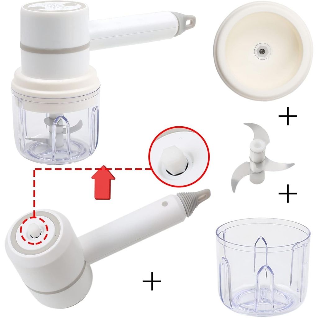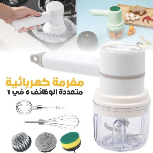 جهاز متعدد الوظائف – مفرمة كهربائية لاسلكية مزودة بـ 6 رؤوس قابلة للتبديل، تعمل كمفرمة خضروات وثوم، مخفوق بيض ودقيق، منظف حوض، منظف فرن، وغسالة أطباق صغيرة.