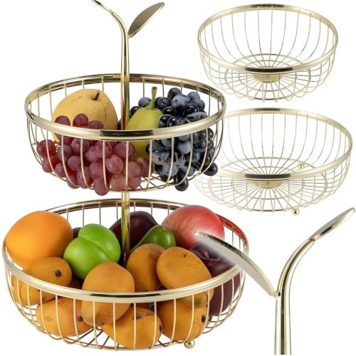 حامل فواكه معدني من طبقتينمصنوع من معدن قوي مع لمسة نهائية ذهبية أنيقة.تصميم ذو مستويين لزيادة مساحة التخزين.هيكل مفتوح يحافظ على التهوية والانتعاش.إضافة عصرية لديكور المطبخ أو غرفة الطعام.مثالي للفواكه، الخضروات أو مستلزمات المطبخ الأخرى.