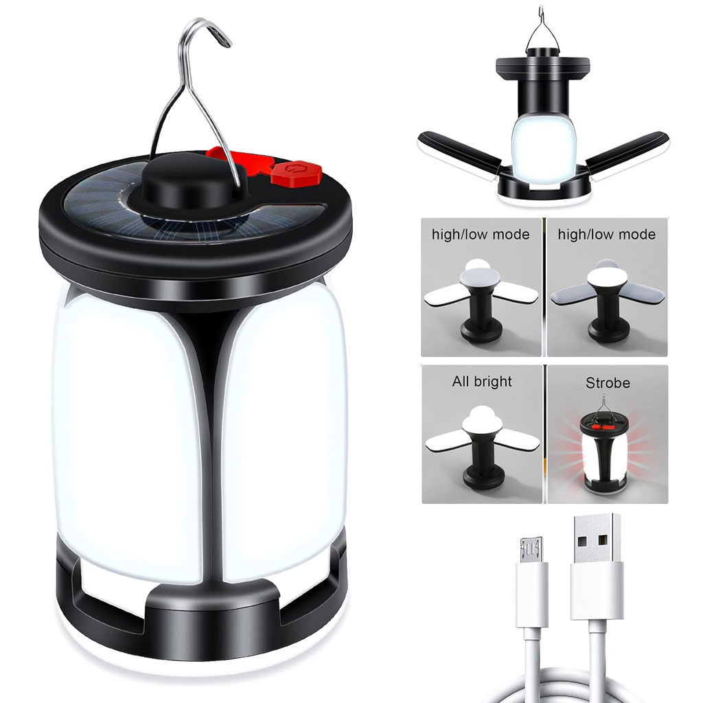مصباح تخييم LED متعدد الوظائف: 6 أوضاع إضاءة لتلبية احتياجات مختلفة. بطارية مدمجة 3600mAh تدوم حتى 10 ساعات. شحن عبر USB أو الطاقة الشمسية. تصميم قابل للتعليق بإضاءة واسعة ومقاوم للماء IPX4. يستخدم كإضاءة طوارئ وبنك طاقة لشحن الهواتف. خفيف الوزن وسهل الحمل في حقيبة الظهر.
