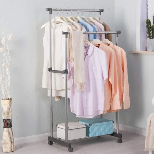 العلاقة مع رف التخزين ستكون حلاً مثالياً لمشكلتك، حيث تتكون من هيكل قوي من الفولاذ المقاوم للصدأ بسعة كبيرة وحمولة تصل إلى 40 كغ لتعليق الملابس والأحذية بسهولة، إضافة إلى عجلات تسهّل نقله بكل راحة داخل الغرفة.