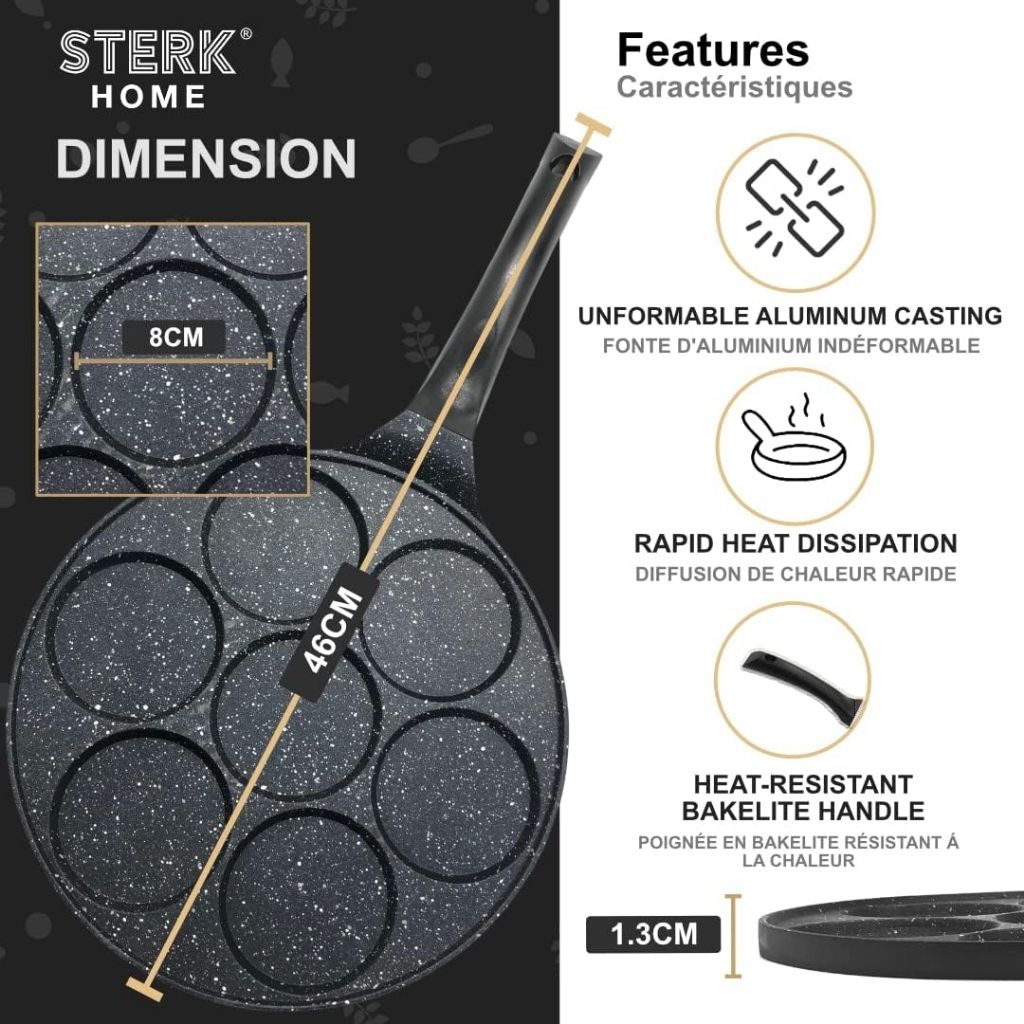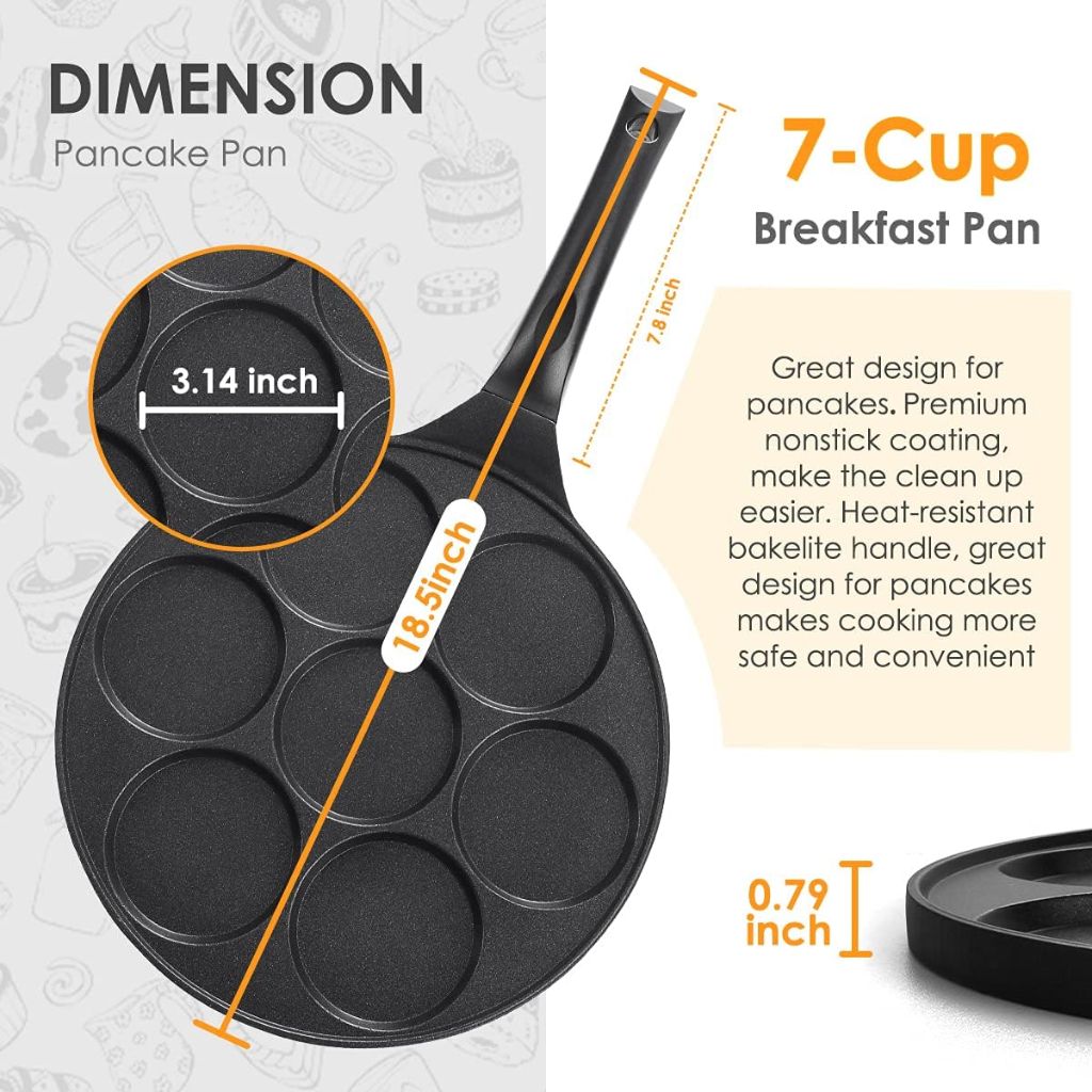 Conception à 7 Moules : Cette poêle est dotée de sept empreintes, idéales pour préparer simultanément des pancakes, blinis ou œufs uniformes et parfaitement ronds.