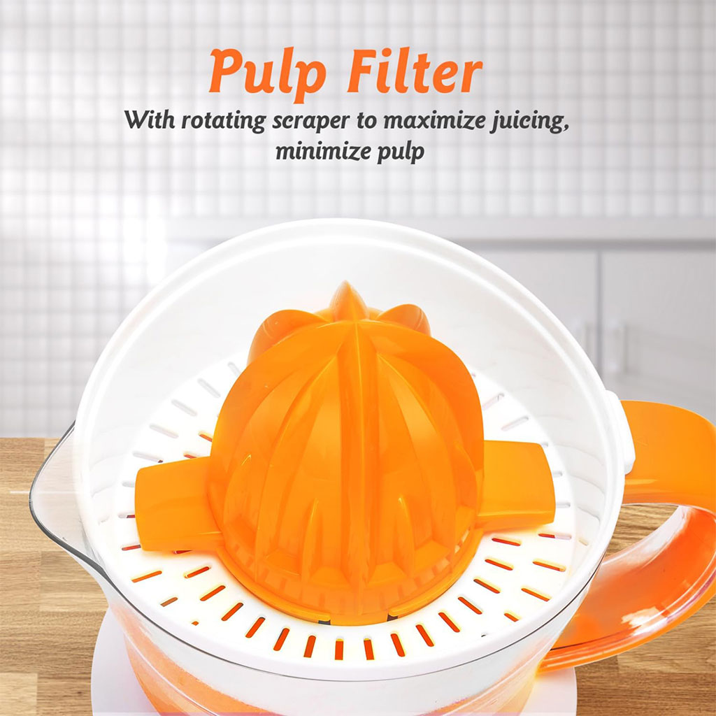 ضع نصف الفاكهة على المخروط واضغط ببساطة لبدء العصر، ثم ارفع يدك للتوقف.
