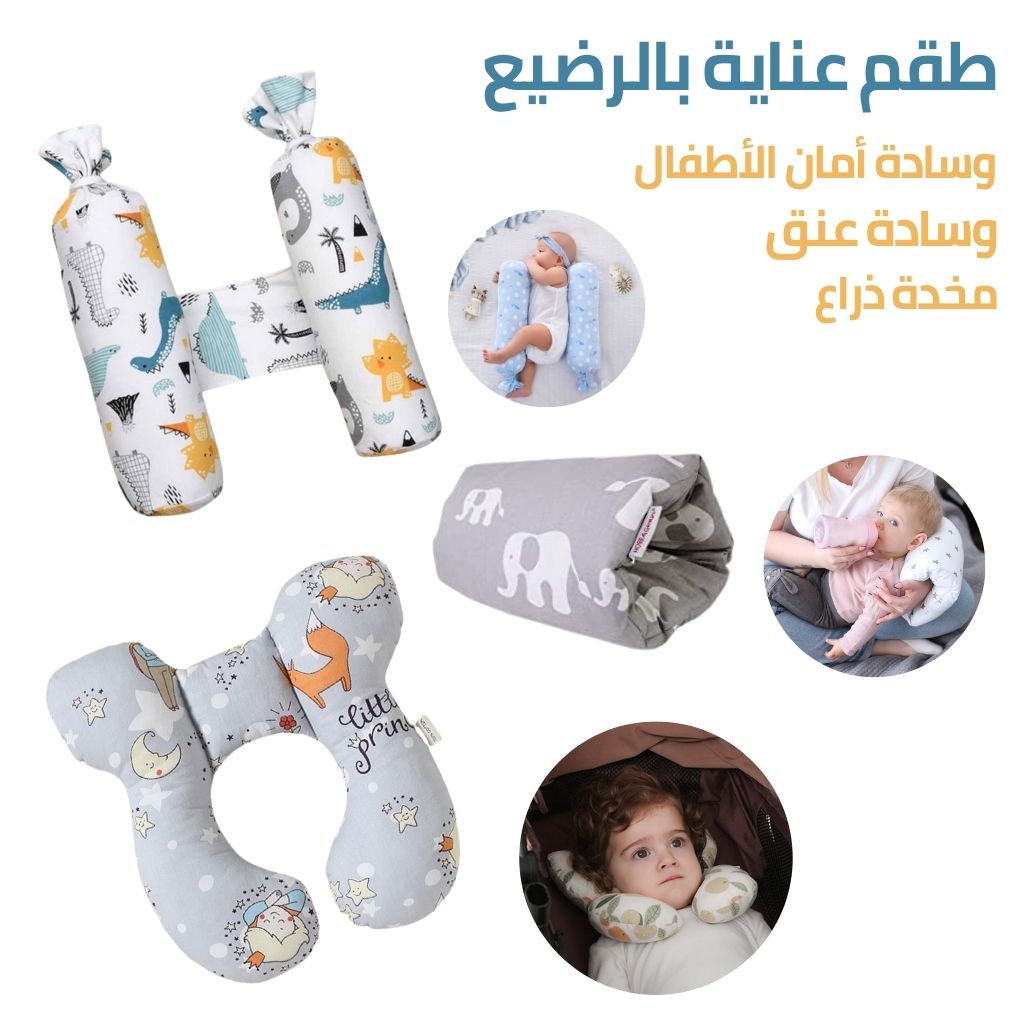“طقم وسادات العناية بالرضيع: راحة وأمان لطفلك!” وسادة أمان الأطفال لتوفير الدعم والحماية أثناء النوم. وسادة عنق مريحة مصممة لدعم رأس وعنق الرضيع. مخدة ذراع مثالية للرضاعة وتخفيف الضغط عن الأم.