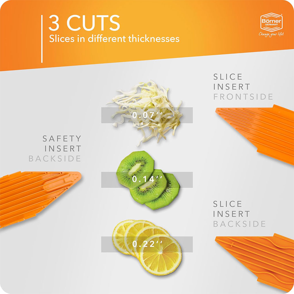 مزودة بشفرات حادة وقابلة للتبديل لعدة سماكات، بما في ذلك التقطيع على شكل أعواد (جوليان).